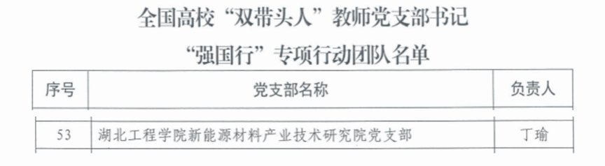 近日,教育部思想政治工作司公布了全国高校“双带头人”教师党支部书记“强国行”专项行动团队名单,我院太阳集团网站8722新能源材料产业技术研究院党支部成功入选。此次入选,是我校基层党组织首次入选全国“强国行”团队,也是学校高质量党建引领事业高质量发展的重要成果,为学校基层党支部标准化规范化建设提供了样板和示范。