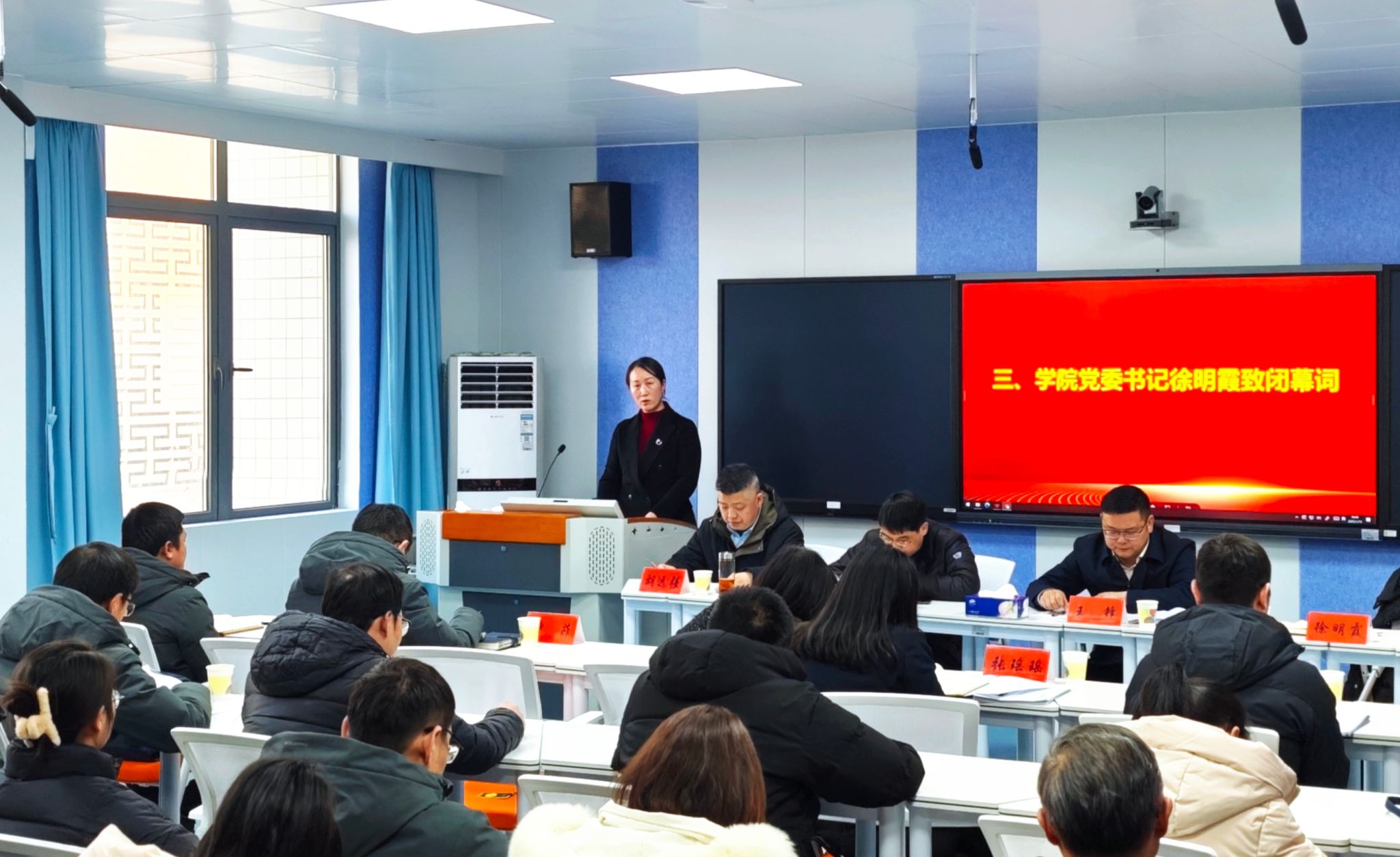 最后,学院党委书记徐明霞作总结讲话,她对教代会的圆满召开表示祝贺,对全体代表的付出表示感谢。她指出,新的一年,让我们以此次教代会为契机,更加紧密地团结在以习近平同志为核心的党中央周围,高举习近平新时代中国特色社会主义思想伟大旗帜,全面贯彻落实学校党委 “三抓三强三提升” 工作思路,持续发扬“讲团结、比奉献、干实事、求发展”的化材精神,鼓足干劲、奋发进取、久久为功、善作善成、奋力开创学院高质量发展新局面,为学院早日实现“双一流”建设目标而努力奋斗!