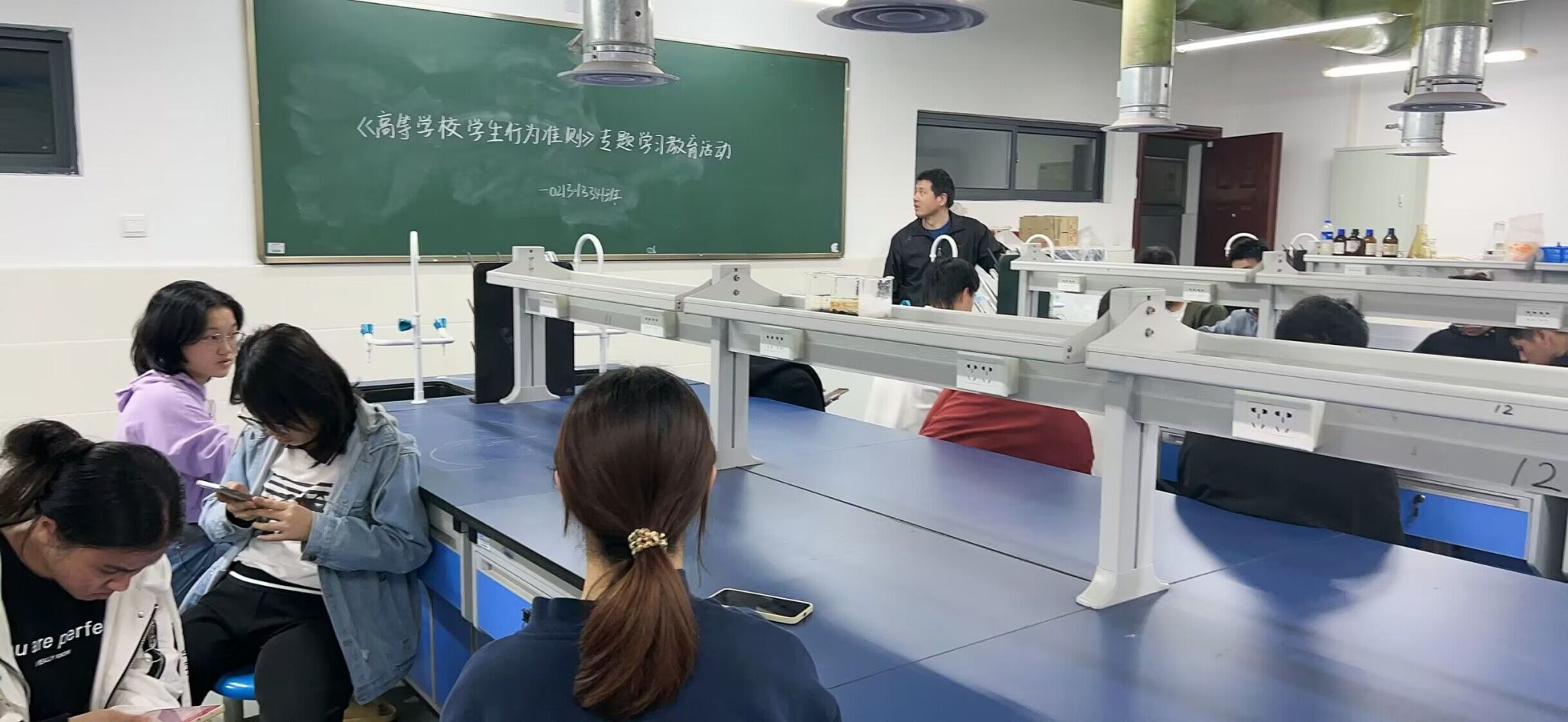 42日下午,化材学院全体班级利用晚点评开展校纪校规学习主题教育活动”。活动中,各班主任利用《高等学校学生行为准则》及《学生手册》中学生违纪处分办法进行校纪校规教育。